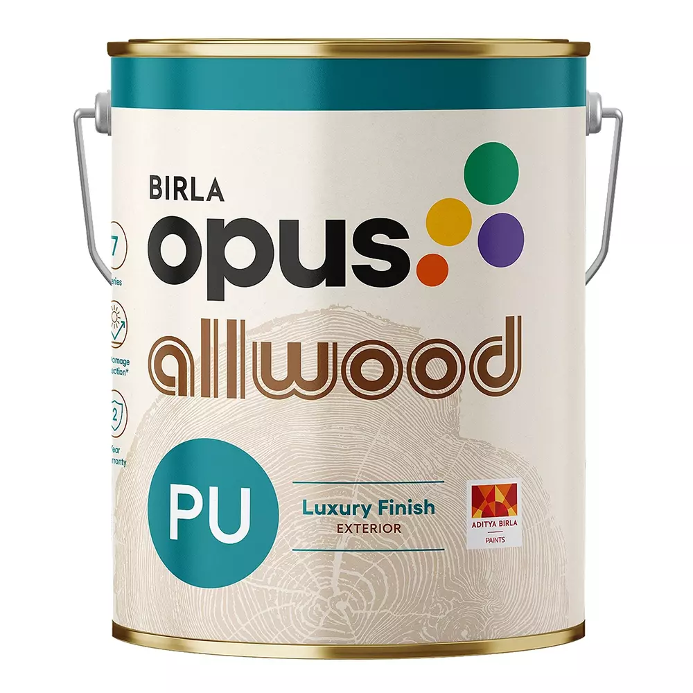 Birla Opus Allwood PU Color Exterior Gloss is designed for exterior wood, offering UV resistance, weather durability, and a colored gloss finish.